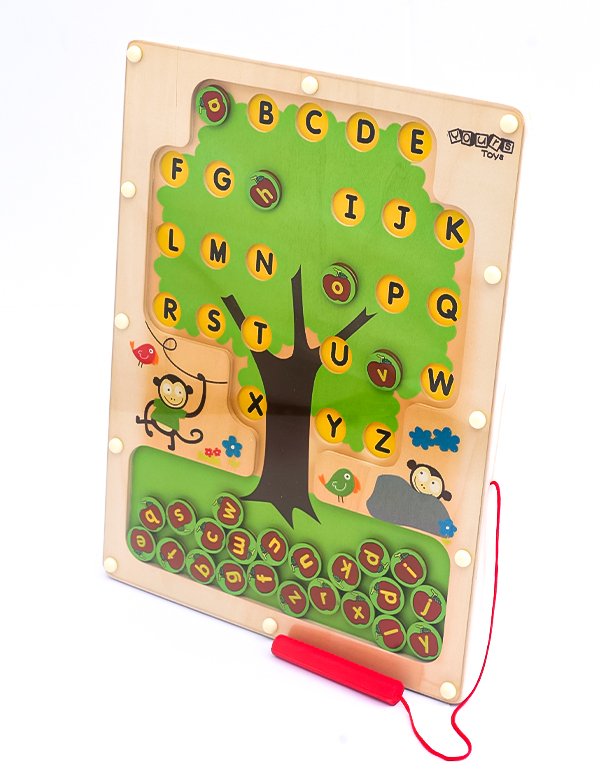 This educational wooden puzzle board is designed in a fun tree shape, featuring capital letters A to Z carved into the board, with movable lowercase letters as individual pieces.